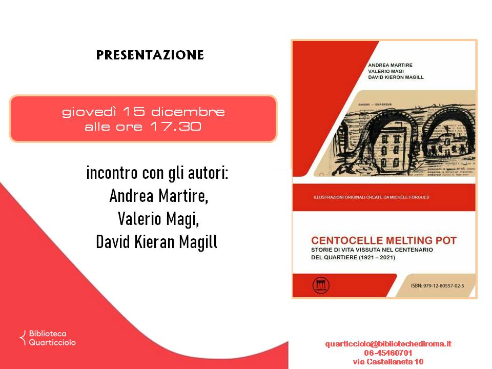 Vi aspettiamo. Giovedì 15 dicembre alle 17 30 presso Biblioteca Quarticciolo parleremo del nostro libro Centocelle Melting Pot, di un quartiere fatto da persone diverse ma che hanno in comune soprattutto la voglia di starci. 21 storie, tanta umanità, in pratica tutto il mondo. Un'occasione importante per parlare di tanti aspetti.