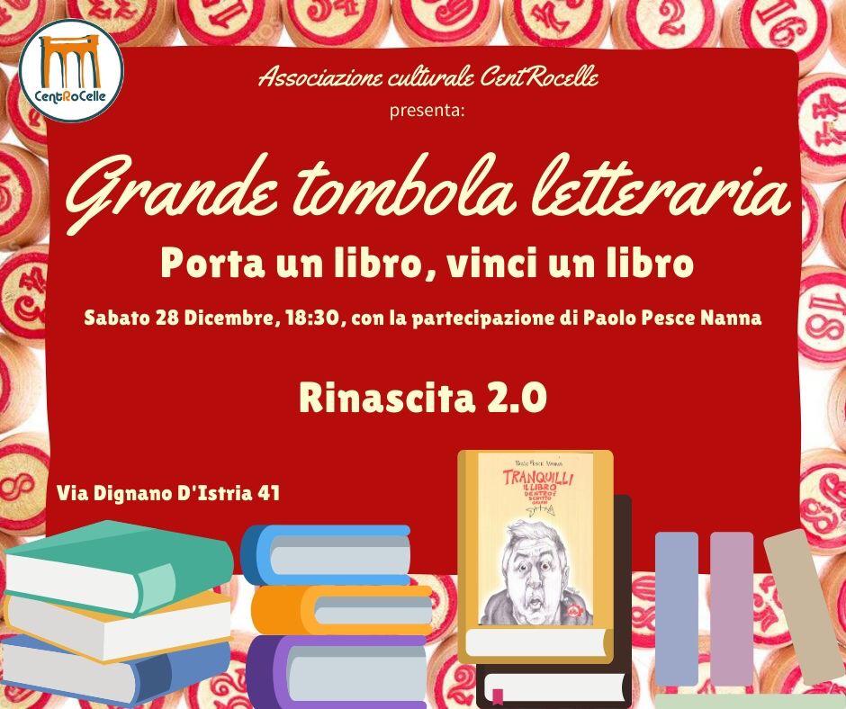 Proponiamo una versione letteraria e divertente del tradizionale gioco della tombola. Non si vincono soldi ma libri, quelli che ciascuno porterà da casa! Un ottimo modo per liberarsi di vecchi residui (ma ancora in buone condizioni, ci teniamo!) e divertirsi con Tranquilli il libro è scritto grande! l'ultima fatica letteraria del nostro banditore, Paolo Pesce Nanna